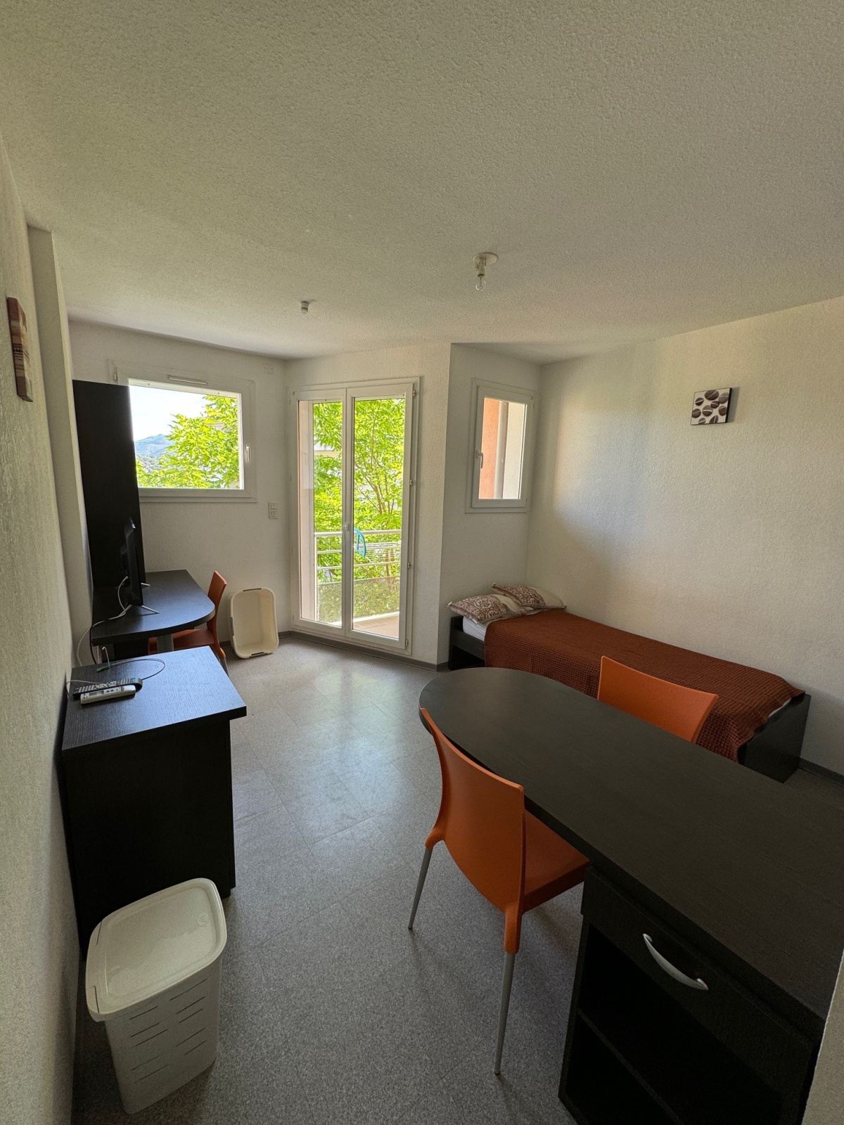 Il se compose d'une kitchenette, d'une pièce à vivre avec lit, bureau et placard de rangement, une salle d'eau et un balcon.